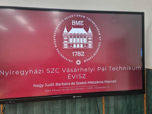 A mai nap folyamán pályaorientációs céllal ellátogatott hozzánk - a BME Építőmérnök karáról - Nagy Judit Barbara (a Vízépítési és Vízgazdálkodási Tanszék doktorandusza) és Dr. Szabó-Mészáros Marcell,akik bemutatták a választható szakokat és ismertették a képzési kínálatot!